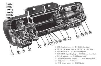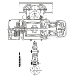 CD1型電動葫蘆主要結(jié)構(gòu):減速器,運(yùn)行機(jī)構(gòu),卷筒裝置,吊鉤裝置,聯(lián)軸器,軟纜電流引入 器,限位器.電機(jī)采用錐形轉(zhuǎn)子電動機(jī),集動力與制動力于一體.